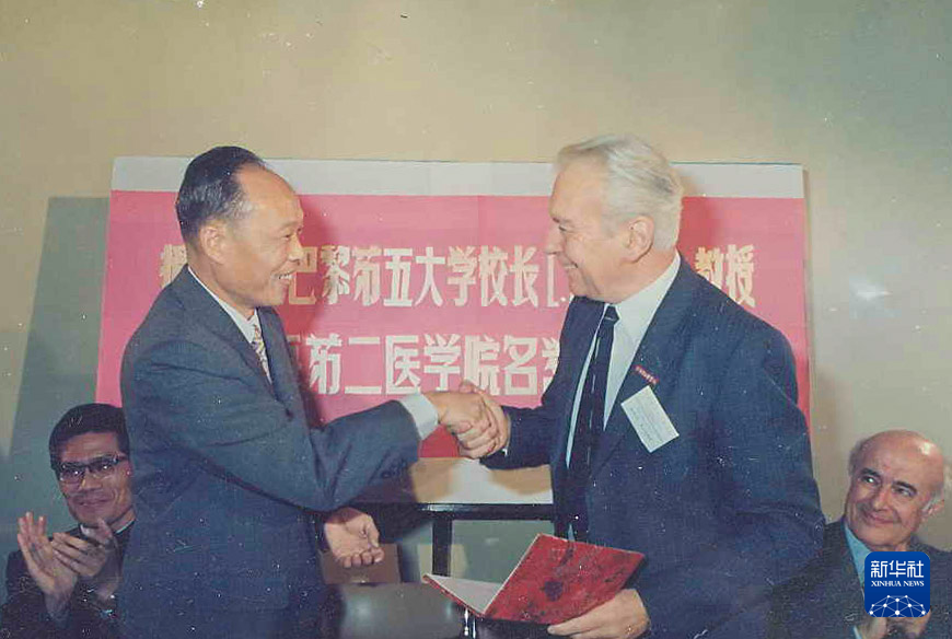 上海第二医学院(现上海交通大学医学院)校长王振义(前左)授予法国巴黎第五大学校长欧基埃名誉教授称号(摄于1985年)。(上海交通大学医学院供图)