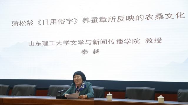 在本次会议上,我院秦越教授、研究生赵薇清同学做了主题发言,与参会的专家学者分享了自己的研究成果。教授秦越作了题为“《日用俗字》所反映的农桑文化研究”的发言。她认为蒲松龄《日用俗字》之“庄农章”和“养蚕章”,总结记叙了三百年前淄川及周边地区农业生产和养蚕丝织的丰富经验,对研究清代初期北方农桑经济和农桑文化具有重要价值。乡村振兴背景下,阐释《日用俗字》中的地域性农桑文化,可为当前鲁中地区发展农桑产业,打造淄博农产品新 IP 提供智力支持。