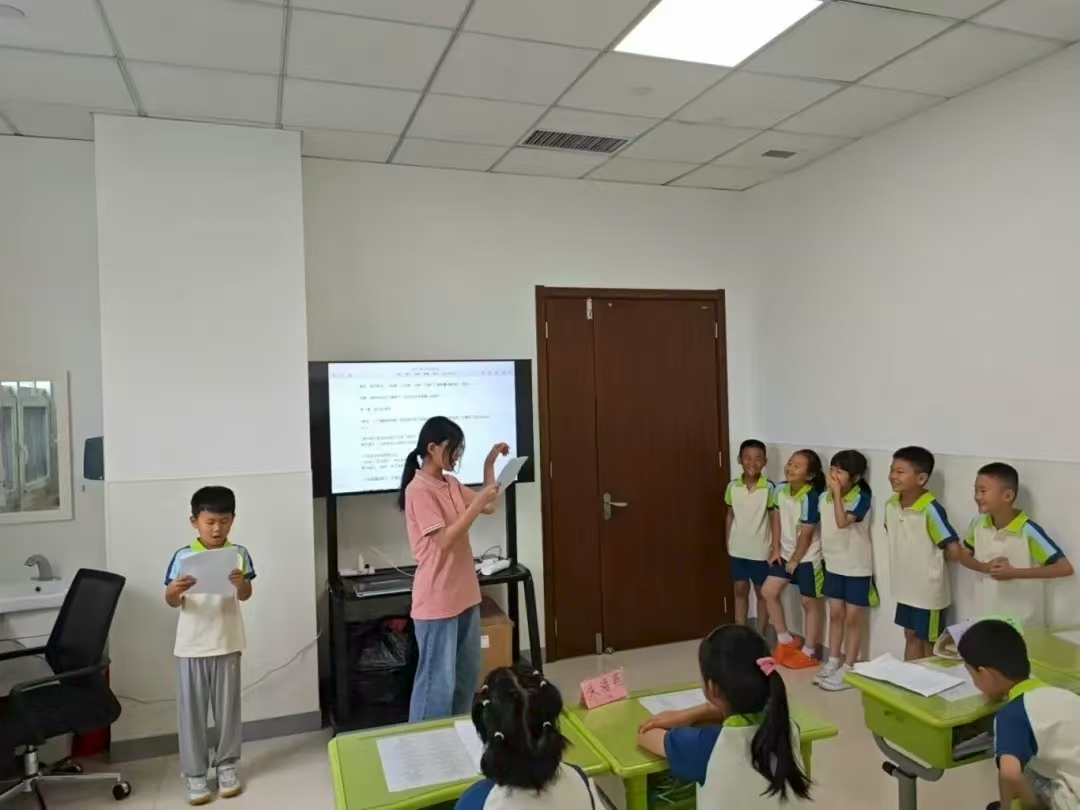 将各个故事改编成符合对应年级孩子理解能力的童趣对白,并且总结出“四步戏剧工作法”—— 故事讲解、角色分配、排练打磨、正式演出,为每个班级的课本剧表演保驾护航,让孩子们既能玩得开心,又能理解故事所蕴含的智慧。针对一年级一班的《小马过河》,实践团成员考虑到一年级孩子的认知特点,把故事里复杂的情节简化,用简单直白的语言改编对白,让孩子们更容易理解小马面对河流时的犹豫以及最终勇敢尝试的过程。对于一年级二班的《动物王国开大会》,则突出了故事的趣味性和节奏感,改编后的对白充满童真,能很好地吸引孩子们的注意力。二年级一班的《亡羊补牢》,实践团成员结合二年级孩子的认知,将故事改编得通俗易懂,用孩子能明白的语言讲述牧羊人从失误到改正的过程。二年级二班的《狐假虎威》,在之前改编的基础上,结合二年级孩子的理解能力,进一步丰富了角色的对话,让寓言智慧更易被孩子们接纳。综合班的《晏子使楚》和《草船借箭》相对复杂,实践团成员则着重简化了故事背景和人物关系的描述,用生动的语言讲解历史典故,让孩子们能跟上故事的节奏。