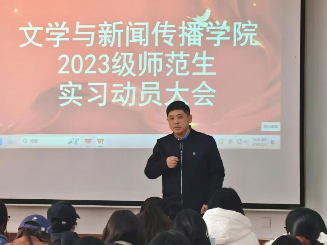 为扎实推进教育实习工作,帮助学生明确实习目标、压实实习责任,确保人才培养关键实践环节高质量落地见效,3月6日下午,我院在2号教学楼227教室召开2023级师范生实习动员大会。学院党委书记王建兴、党委副书记刘晓东、副院长翟羽佳、中文系副主任金梦鸽、辅导员华蕾及2023级全体师范类学生参加本次大会,会议由金梦鸽主持。
